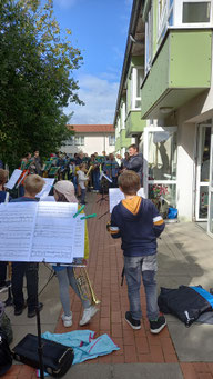 Anschließend gegen 14.30 Uhr machten wir uns mit Instrumenten und Noten bepackt auf den Fußweg und trafen uns bei der Seniorenresidenz Sandesneben, um den Bewohnern den Nachmittag mit einem Ständchen zu versüßen. Wir wurden mit Café und Kuchen von der Einrichtungsleitung belohnt. Die Senioreninnen und Senioren waren überglücklich und honorierten unser Spielen mit einem kräftigen Applaus. Im Nachgang haben die Senioren für uns Bläserinnen und Bläser ein Gedicht verfasst, welches uns zugeschickt wurde und weiter unten gelesen werden kann.