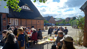Die vormittägliche Probe wurde nur kurz von einer Cafépause, für Kuchen hatten fleißige Bläser gesorgt, unterbrochen. Die Zeit verging bei fröhlicher aber konzentrierter Probenarbeit wie im Fluge und schon war Zeit für das gemeinsame Grillen. Wir ließen uns verschiedene Salate, Grillfleisch, - würstchen, -käse und -gemüse schmecken und freuten uns, dass es zwar recht kühl, aber sonnig und trocken war.  Danke Rüdiger (Kantor der Kirchengemeinde Sandesneben) für die tolle Hilfsbereitschaft und das Grillen.