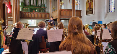 Wir starteten mit einer Probe für den großen Chor, bestehend aus ca. 25 Bläsern in der Marienkirche. Zeitgleich bereiteten sich zwei Jungbläsergruppen mit insgesamt 18 Jungbläsern unter der Leitung von Michael Buffo und Markus Lantau, der extra aus Kiel angereist war, auf unser abendliches Konzert vor.